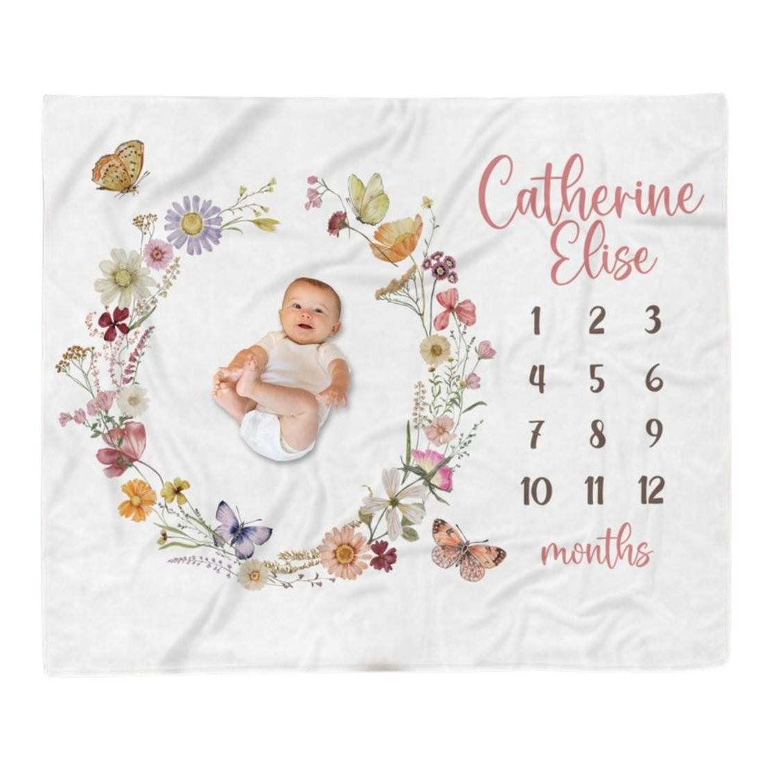 Wildflower Baby Girl Milestone Blanket, Monthly Baby Growth Tracker Blanket, Newborn Girl Photo Prop, Floral Baby Shower Gift